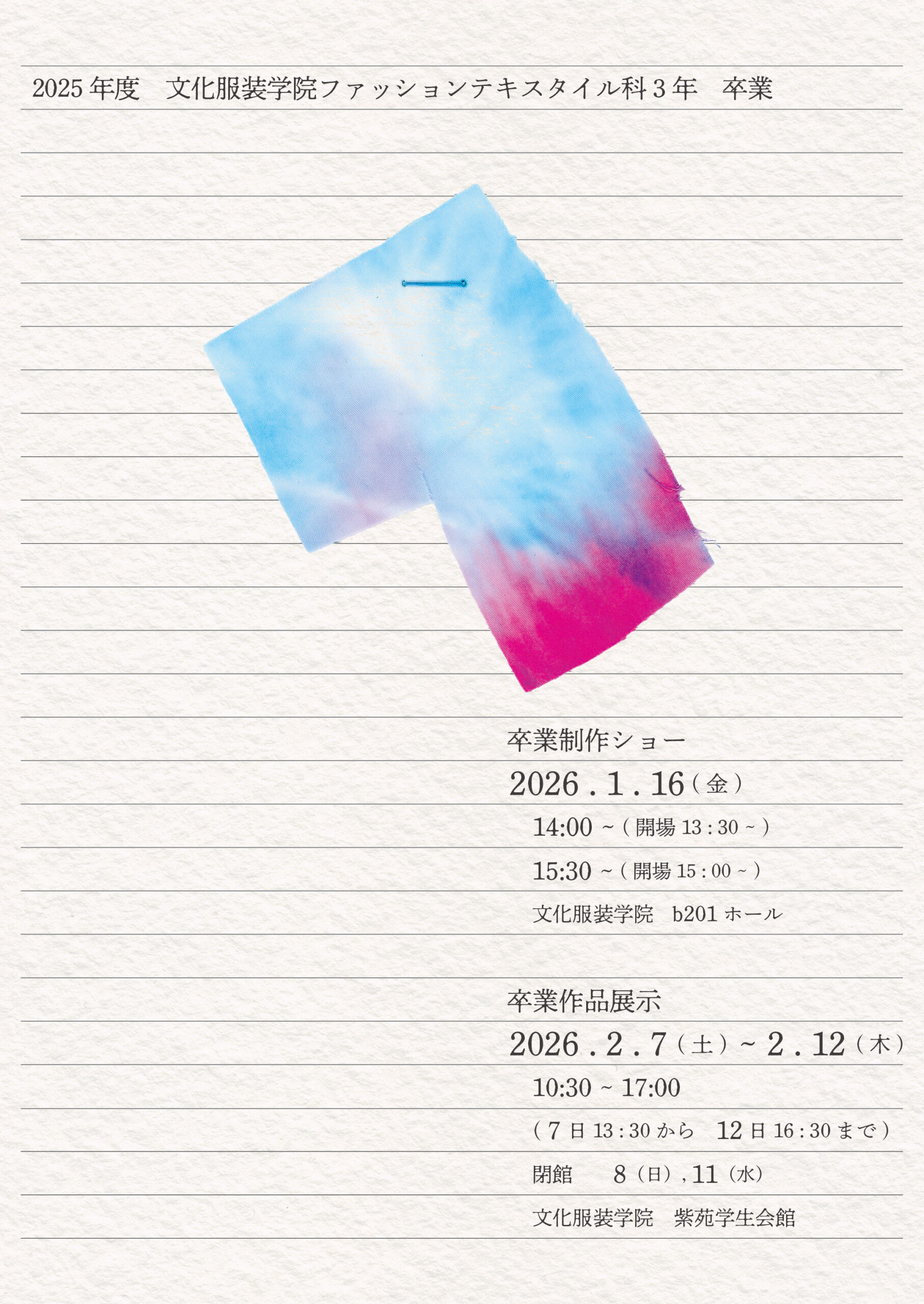 織り、染め、プリントなど、テキスタイル制作のあらゆる技術を専門的に学ぶファッションテキスタイル科。3年間の学びの成果をファッションショーと展示で披露します。ぜひご覧ください。
