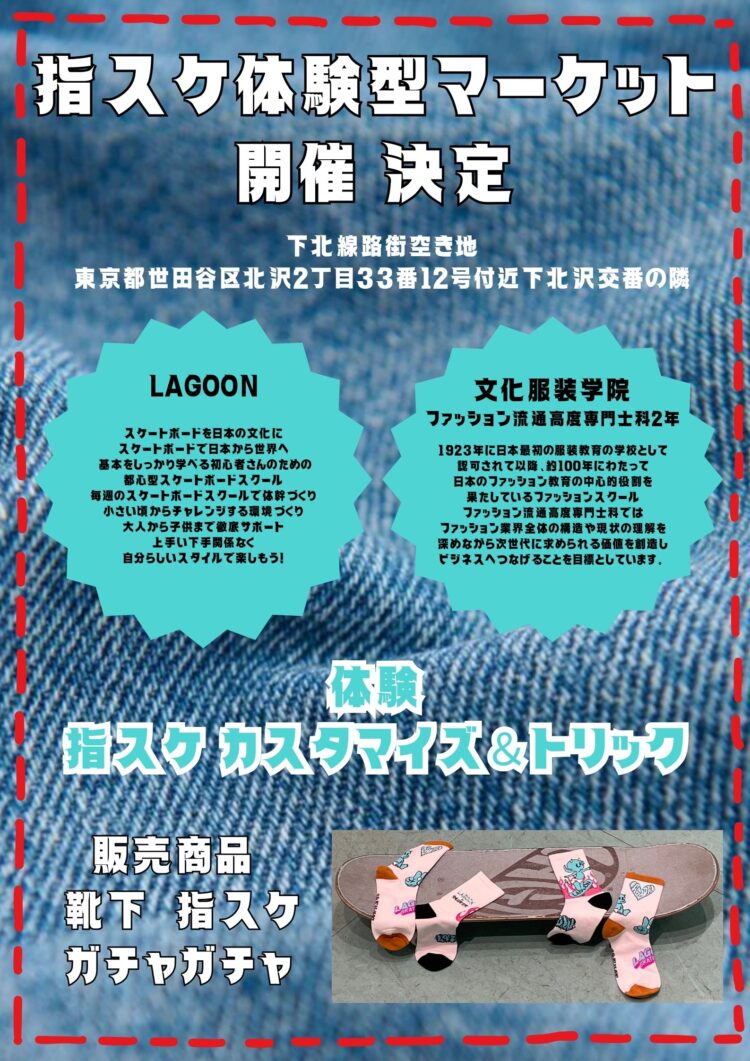文化服装学院ファッション流通高度専門士科2年の学生は、原宿のスケートボードスクール(株)LAGOONとコラボレーションし、若者・親子向けの新感覚発信イベントを2月15日(土)、16日(日)12時〜17時下北沢フリーマーケット(下北沢線路街 空き地)で開催します。