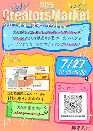 BUNKAの学生会組織「学友会」主催によるクリエーターズマーケット。文化生が作った1点モノや、個性溢れるこだわりの作品を販売します。