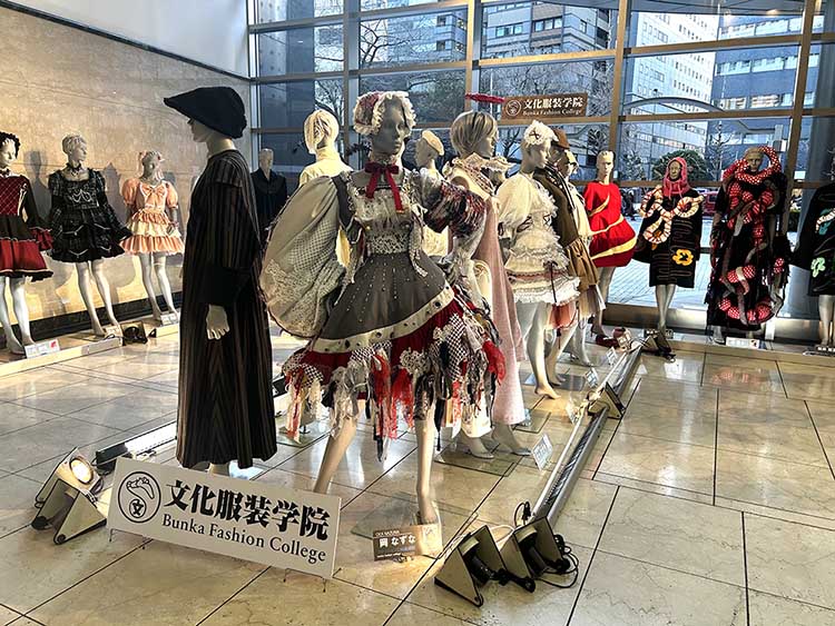 服装科1年、ファッション工科基礎科1年の修了制作作品のワンピースドレスを展示。入学後1年間で服づくりの技術を身に付けた1年生の作品をぜひご覧ください。
