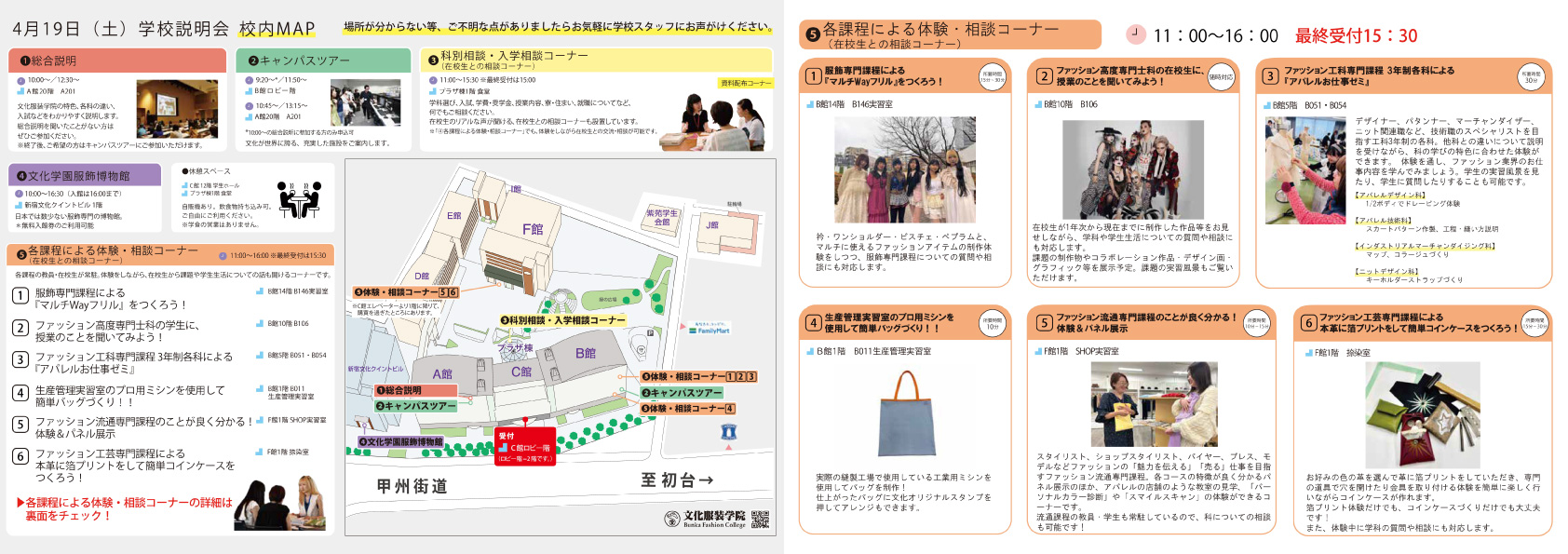 文化服装学院の各課程の教員や学生による授業説明や体験コーナーを設置!