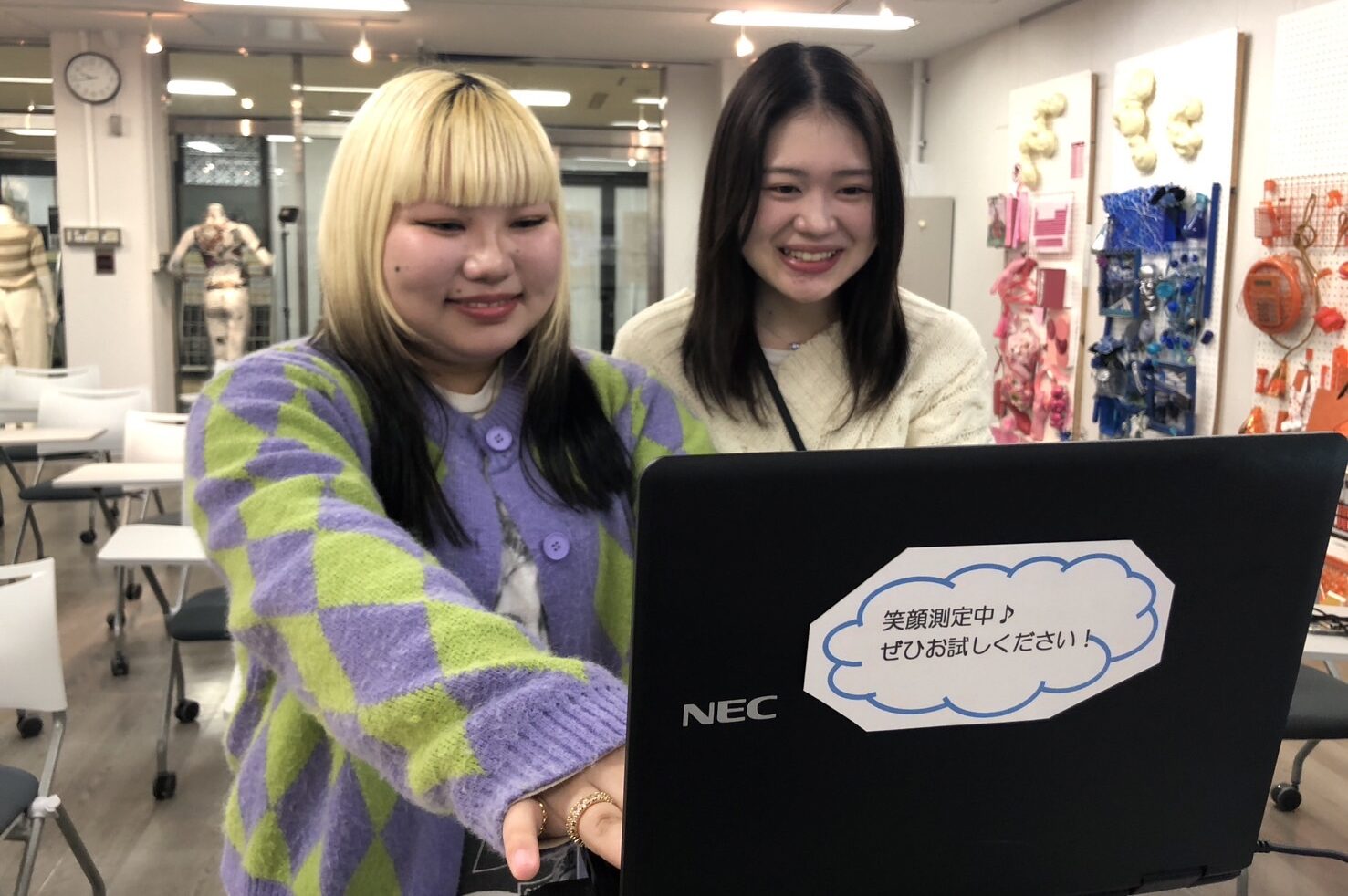 スタイリスト、ショップスタイリスト、バイヤー、プレス、モデルなどファッションの「魅力を伝える」「売る」仕事を目指すファッション流通専門課程。各コースの特徴が良く分かるパネル展示のほか、アパレルの店舗のような教室の見学、「パーソナルカラー診断」や「スマイルスキャン」の体験ができるコーナーです。