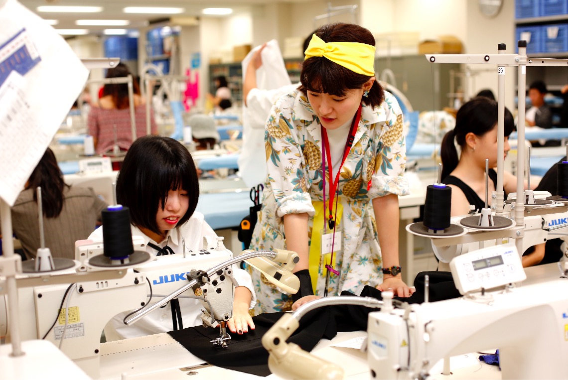 洋服を生産する工場と同じ、専門的なミシンを使用してオーバーシャツを縫製します。使用するミシンの中には、自動でボタンを付けることができるような特殊なものもあります。 生地を事前に選んでもらうので、当日は裁断済みの材料を配布し、縫製からスタート。サイズはフリーサイズなのでどなたでもゆったり着ることができます。