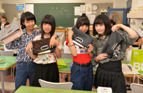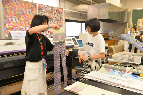 パソコンを使ってデザインした柄をスクリーンプリントして、「キラキラ☆Tシャツ」や「カラフル♪タイツ」など、おしゃれな柄アイテムをつくってみよう。