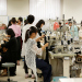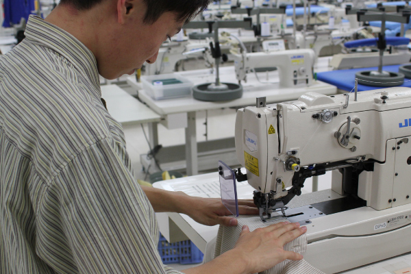 洋服を生産する工場と同じ、専門的なミシンを使用してシャツを縫製します。使用するミシンの中には、自動でボタンを付けることができるような特殊なものもあります。生地とサイズを事前に選んでもらうので、当日は裁断済みの材料を配布し、縫製からスタート。サイズはM・L(メンズにも対応)から選ぶことができます。
