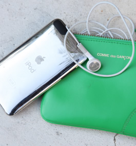 “コム デ ギャルソン”のポーチには、仕事道具であるiPodを入れて。