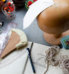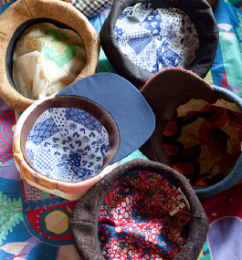 帽子作家として日々帽子制作をこなしている“nokkuの帽子屋”こと横山さん。帽子作家になるからには、もともと帽子が好きだったのだろうか。「小さい頃から帽子を被るのが習慣にはありました。ハットやハンチングなど。でも今は自分の帽子は2つくらいしか持っていませんね」。文化に通いながら帽子作りのノウハウを習得していったのかと思いきや、実はそういうわけでもなかったようだ。「文化に入る前から帽子をやりたかったんですけど、実際は文化では帽子専門というよりもバッグや手芸、刺しゅうなど、総合的に帽子に必要なことを学びました。」。文化では帽子作りの基礎を学び、さまざまな知識と技術を身につけていったようだ。しかし今もまだまだ勉強中なのだとか。