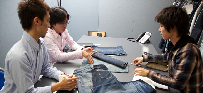 デニムのOEMを請け負う会社で営業として働いている中嶋さん。そもそもOEMとは『相手先ブランド生産』ということである。具体的にはどんな仕事なのかと言うと「簡単に説明すると、自社ブランドを持っているのではなく、取引先のメーカーさんがデザインしたものを形にする仕事です」。取引先メーカーから依頼された漠然としたデザインイメージを形にするべく、メーカーと製造工場との間に入り、イメージに沿った製品を作り上げる。生地から縫製、糸の種類、釦などの付属品を決めて、ある程度の物が出来上がったら、二次加工と言われる段階に入る。加工工場に持っていき、デザイナーのイメージに合う加工を施し、第一段階で上がったものを提出。そこで納得するか修正するかによってサンプルを繰り返し展示会へ、という流れだ。