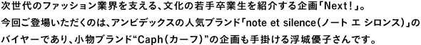 就職活動で参加した会社説明会で、仕事を兼務している方が多い現在の会社に魅力を感じ応募した。一度は企画職としての応募に落ちるも、再度販売員として応募することに。「今は企画をしたいと思っているけど、この会社なら枠にとらわれない事ができるかもしれない」と感じたそう。そして入社後「ノート エ シロンス」の販売員として働くことになる。 浮城さんは、もともと接客される事が苦手で、入社当時の目標は“嫌われない接客をする”ことだった。「今では接客されたくない側から、接客されたい側に変わりました」。それは、販売員は商品に対する情報を持っていて、それを聞かなければ損だと思うようになったから。色違いやサイズ違い、デザインされた経緯や、それに込められた想いなど、そのアイテムに関わる情報は接客されなければ分からないからだという。「販売員の商品に対する情熱が伝わるお店が好き」といい、今は販売員が楽しそうに働いているお店で買い物することが多くなったそうだ。接客することによって、お客様に商品の魅力を最大限に伝えることができるこの職種にやりがいを感じ、今ではどんなに他の業務で忙しくても、お店に立つ時間を惜しむことはない。