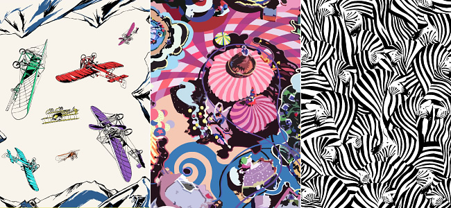 左から飛行機、遊園地、シマウマをモチーフに描いた作品。