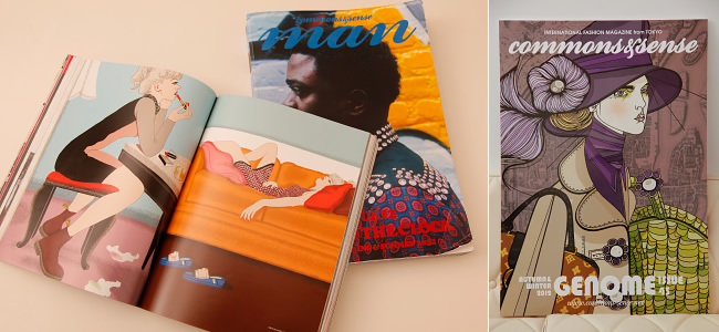 (左)大ボリューム(なんと計442ページ!)で発売された前号「コモンズ&センス マン」 ISSUE12と、ファッションページをイラストで魅せるというまったく新しい切り口は「コモンズ&センス」(ISSUE42より)ならでは。