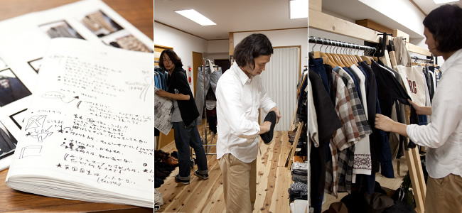 (右)同じ文化服装学院の卒業生で友人でもある「JAMA RICO」のデザイナー、加納 学さんのプレスルームにて。