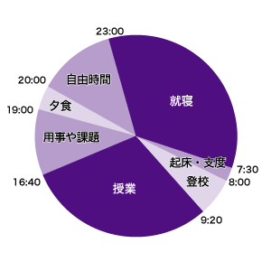 1年次から2年次まで雑誌『装苑』のパパラッチ隊として、学内のおしゃれな人を見つけて取材していました。また2年次にはこの科の先輩たちと一緒にカンボジア研修に参加。日本の文化やファッションについて伝えてきました。国内外のファッションブランドを扱うPR会社でインターンも経験。とにかく興味を持ったことはやってみる、がモットー。おかげでこの4年間で人脈も視野も広がり、自分が将来目指したいことも見えてきました。Q5.一日を円グラフで表すと?