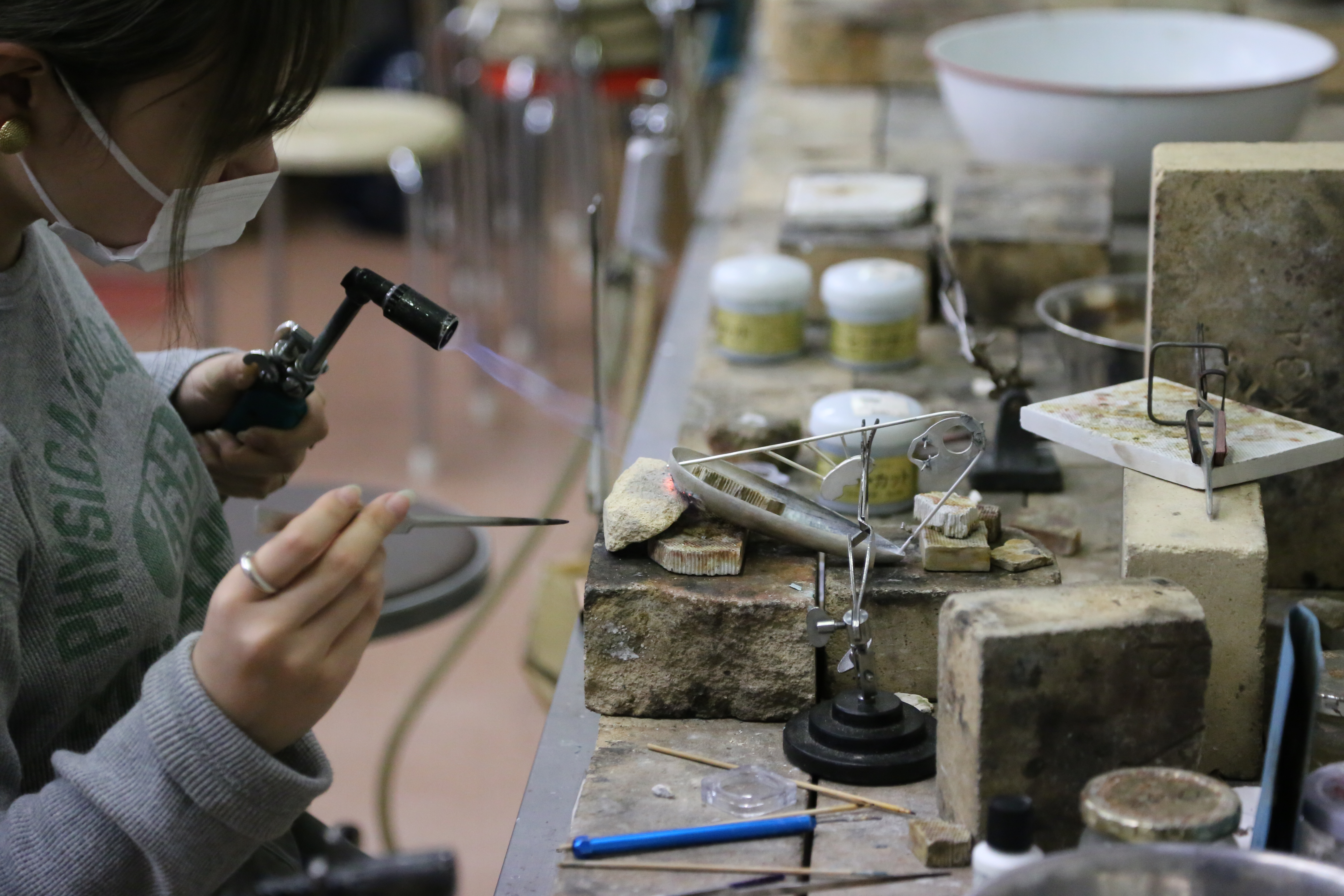 エナメルワークです。普段はシルバーや真鍮など貴金属を扱うことが多い中で、鮮やかな色のガラスを使うことに新鮮さを感じているからだと思います。窯の中でガラスの釉薬が溶けていく瞬間が魅力的です。エナメル以外にも、進級するごとに使用する素材が増えていきます。新しい技術を学ぶので楽しい反面、本当に難しくて大変。でもその代わり、一生の仕事としてやってい技量を身につけている実感を得られてやりがいを感じます。