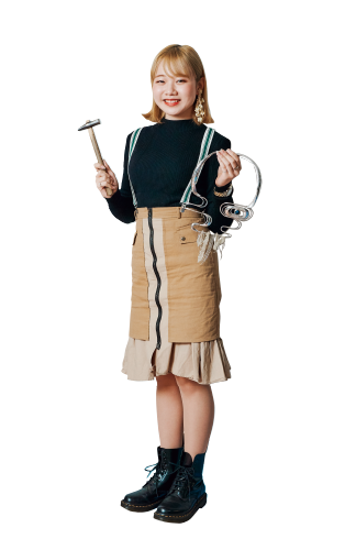 ジュエリーの制作に必要な知識と技術を学んでいきます。ジュエリーの専門学校と違い、文化のこの科はファッションをベースにしていることが大きなポイントです。文化祭や企業コラボの授業など、服やテキスタイルを作る科の学生と仲良くなる機会が多いので、視野が広がり、全身や空間全体を捉えたうえでジュエリーを作る姿勢が育まれると思います。初心者でも安心してください。好きという気持ちがあれば必ず上達します。