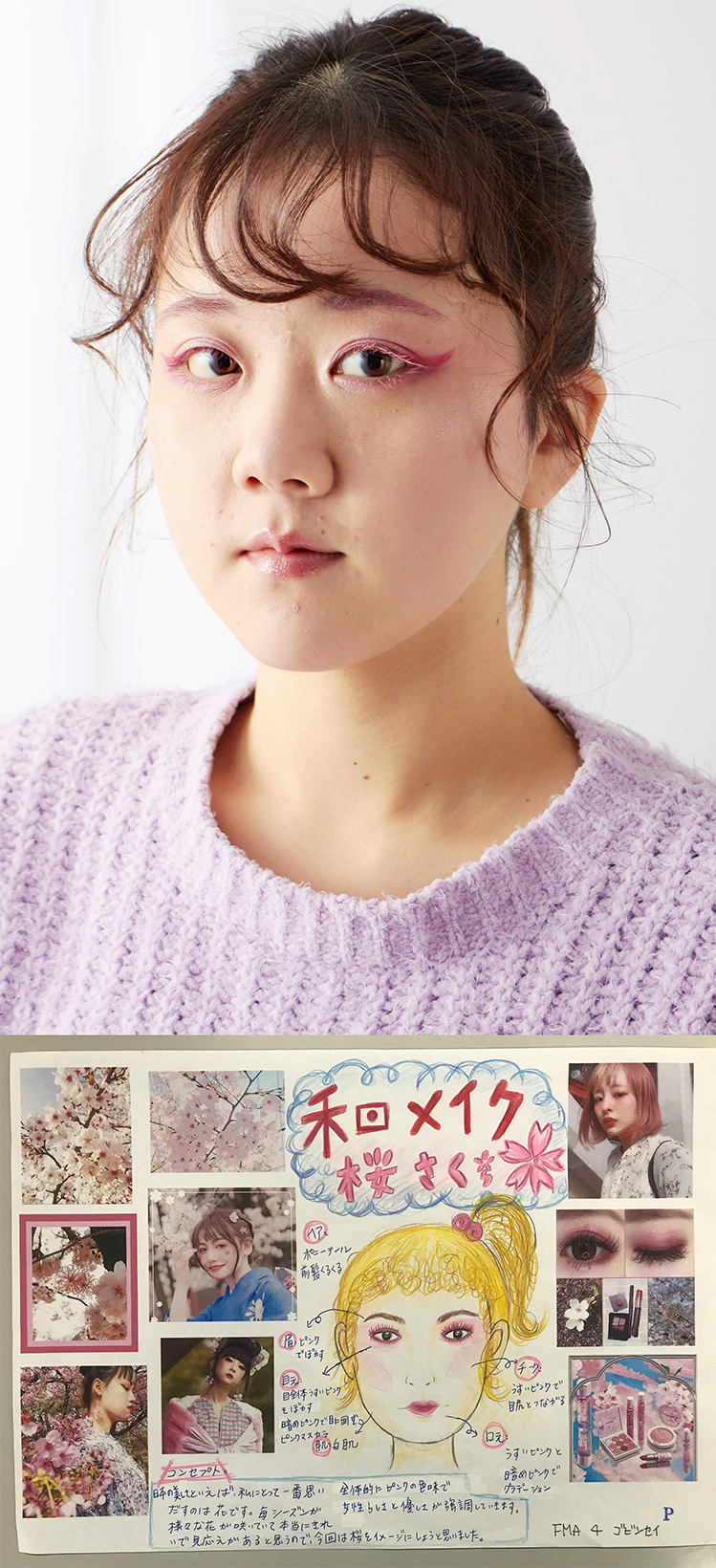 メイク実習です。クラスメイトの顔をモデルに、自分が考えたメイクを実際に施していく授業です。思い通りの表現ができたときや、クラスメイトの表情が変わりきれいになったとき、最高にうれしさを感じます。どの授業も好きですが、この授業は達成感をすごく得られるので毎回気合いが入ります。最初は自分らしさが表現できませんでしたが、テクニックが向上するにつれて、好きな世界観が確立されてきた感じです。ナチュラルなベースづくりを大切にし、目元や唇にポイントを置いたメイクを心がけています。