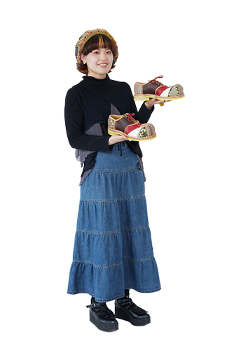 実習のシューズです。モカシンから始まり、レースアップシューズ、パンプス、ブーツ、スニーカーなど一通りのタイプを学びます。3年次に進級してすぐに自分の足を測定してつくるマイラストと呼ばれる木型を制作。このマイラストで課題作品と自分用に2足つくりましたが、完成した時はすごく嬉しかったです。大きな山を登りきった感じというか、これまで学んできた成果が現れた気がしました。このあたりからようやく主要な靴の構造を理解できるようになり、基本を応用して作品に自分らしさを落とし込めるようになってくると思います。まだはっきりとは言えませんが、メンズの革靴をベースに異素材ミックスしたカラフルなデザインが私らしいような。「とにかく手を抜かない」が信条。もっと腕を磨いて個性を際立たせていきたいです。