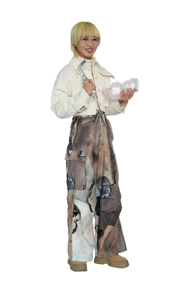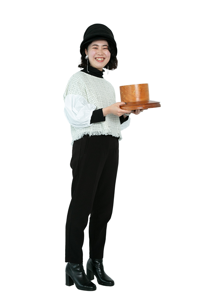 まだ自分らしさを模索しているところですが、知識と技術を習得するほど、帽子では従来使わない素材を用いてつくる帽子にこだわりを持ち始めるようになりました。頭に装着できれば帽子になります。素材だけでなく、フォルムに関しても新しさを常に求めています。就職先はCMやアーティストに向けたヘッドピースを主に手がけるところ。腕を磨いて一人前の職人になりたいです。