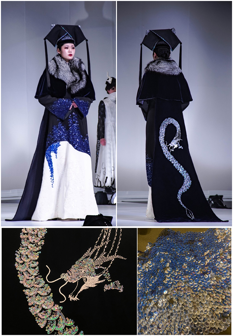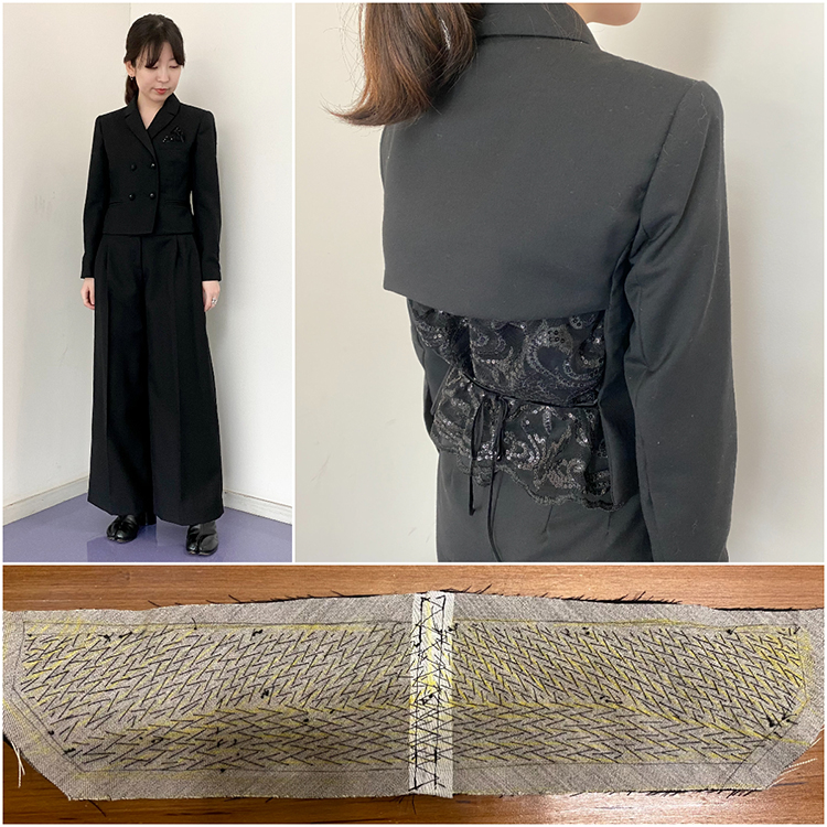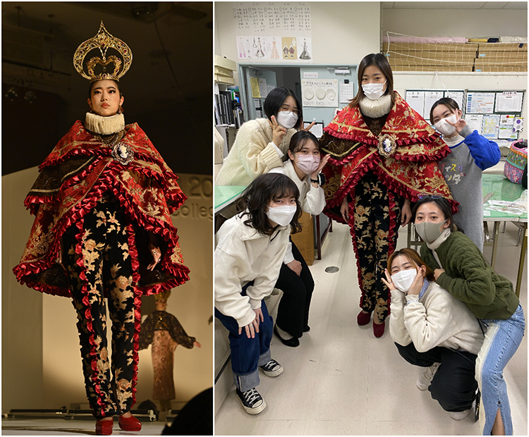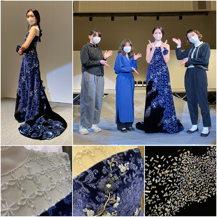 オートクチュール特論では、一流の洋服のデザインから仕立て方までを学びます。現役のオートクチュールデザイナーとしても活躍されている鈴木紀男先生から、直接指導を受けることができるので、毎回とても楽しみです。ひとつの質問に対して、たくさんのことを教えてくださるので、授業を重ねるたびに、作品のクオリティがどんどん上がっていくのが実感できました。こんな貴重な経験は、他ではなかなかできないと思います。また、グループ制作では、分担・協力しつつスケジュールを考えて作業を進めていくことを学び、これから社会に出て働く上でとても勉強になりました。
