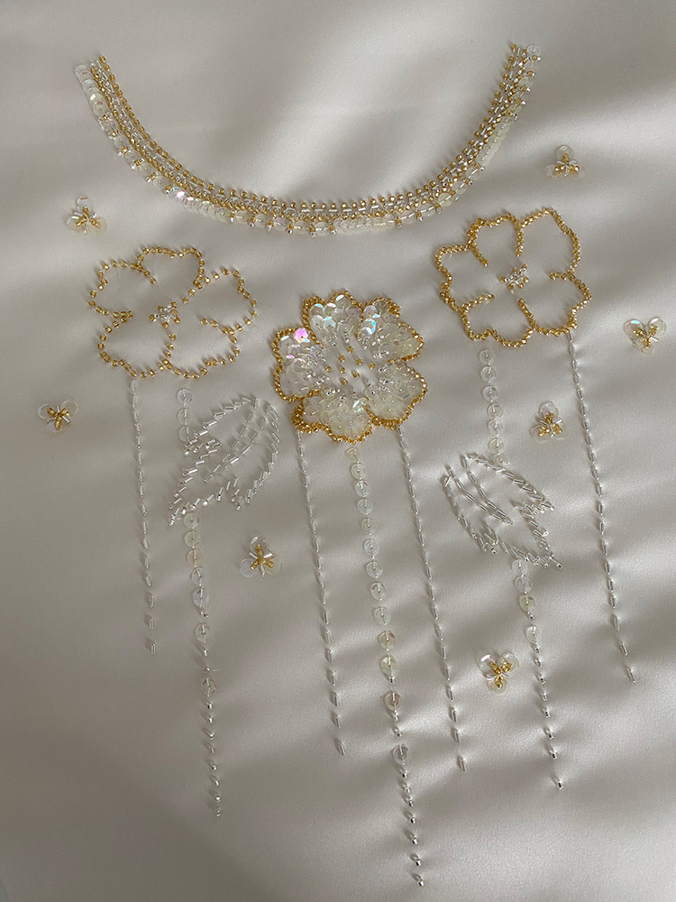 将来、舞台衣装の制作に携わりたかったので、1点ものの服づくりを学ぶためにこの学科を選びました。ここでは手縫いや部分縫い、刺繍など手作業の技術を磨きながら、特別な素材の扱い方も学ぶことができます。授業内容は理論、技術の両方をカバー。課題をこなすうちに、どんどん手作業が早くなり、ミシン使いを含めテクニック面での成長が実感できました。この科の特徴は、グループで制作を行なうこと。5月頭にグループを結成して、それぞれ扱う素材を決めます。その後1ヶ月ごとに、トワル仮縫い、実物仮縫い、縫製チェック、装飾チェック、アクセサリーを合わせたコーディネートチェックと順番に進むので、段階的に知識が増え、無理なく技術が磨かれていきます。クラスは30人ほどの少人数制で、縫製に携わる仕事がしたいと思っている人がたくさん。同じ目的を持っている友達ばかりで、情報交換したり、刺激を受けたりと切磋琢磨できる最高の環境です。