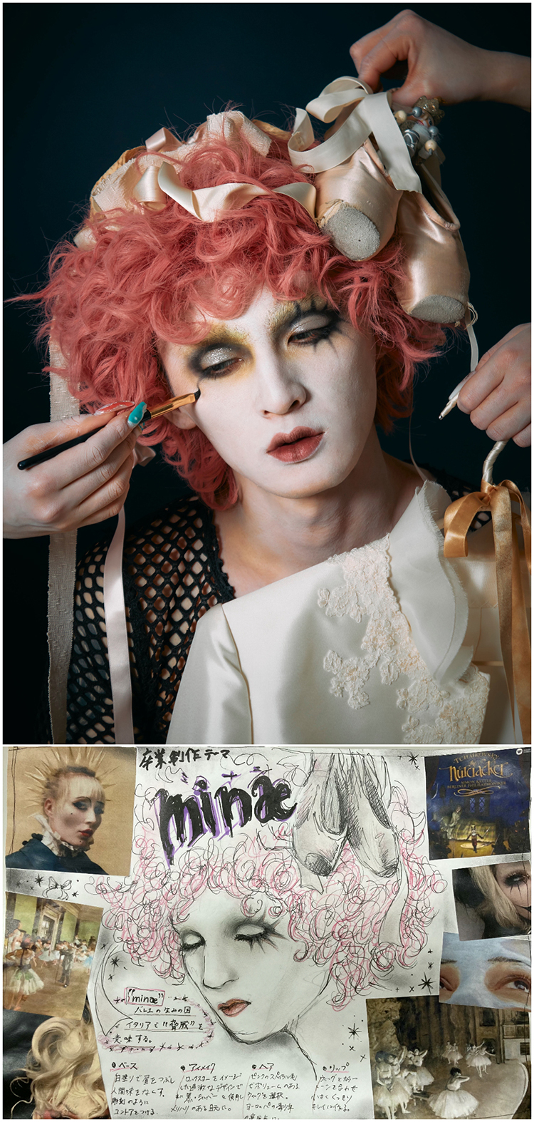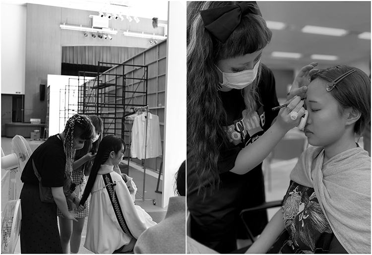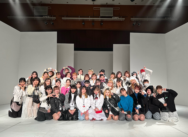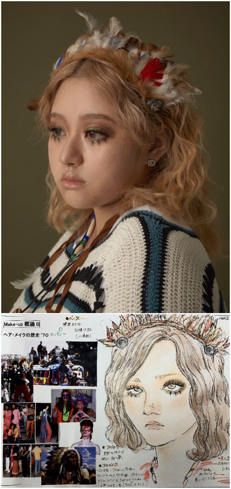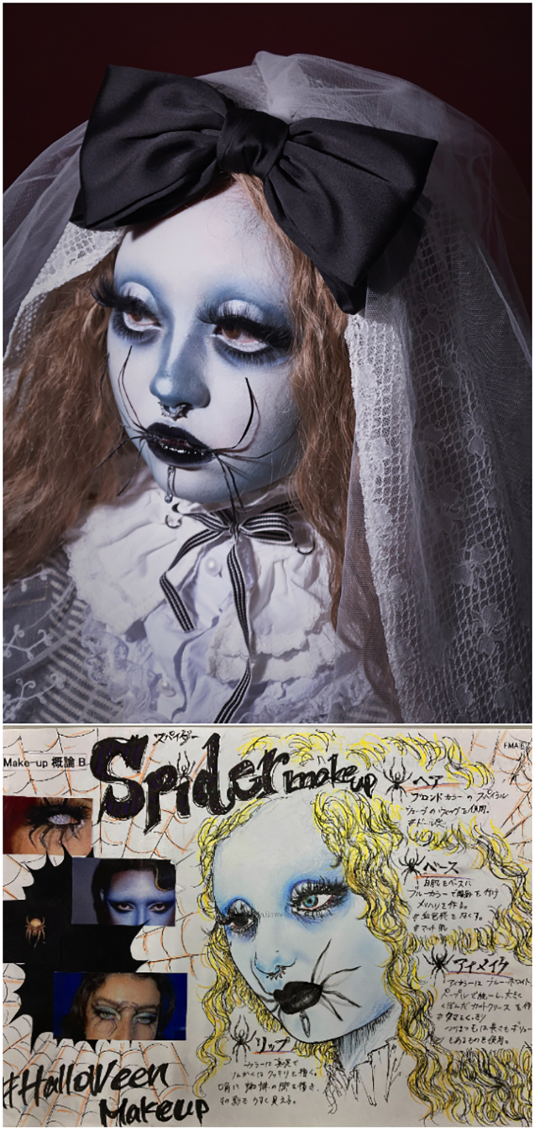 文化はイベントの多い学校です。私はどんなイベントでも必ずヘアメイクの係をする!と入学当初から決めていました。1年次にも数回のイベントでメイクを担当して現場の空気感に触れていましたが、2年次には役職を経験。夏のファッションフェスティバルでは副メイク長、文化祭ではメイク長という、メイクパートの中で責任があるポストについて、ショーの運営側にまわりました。ショー現場でのヘアメイクは、作品としてのヘアメイクとはまったく別物です。臨機応変な対応力も問われるので、本当に大変。テーマは最初から決まっているので自分らしさを前面に出すことはできませんが、自分ならではのちょっとしたアイデアを提案するなど、積極的に関わることを心がけていました。それが通って、実際のメイクのデザインに反映できたときは本当に嬉しくて、もっと頑張ろうと思えました。一方、メイクのデザインが決定し、いざモデルが衣装を着用した状態でメイクを施してみたら「何かが違う……」というケースもあり、直前にデザインが変わることも。応用力を求められるのは大変でしたが、日々練習を重ねて実力がついていたので、無事乗り切ることができました。