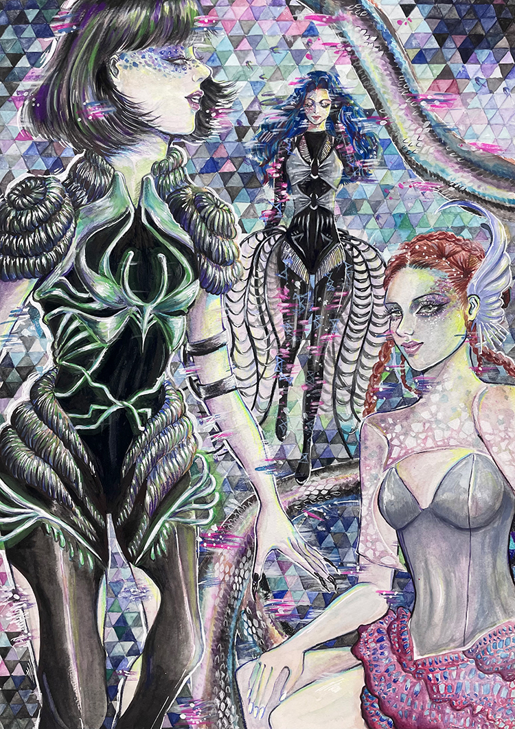 デザイン画の授業。元々絵を描くことは好きなのですが、特にデザイン画は、自分の思い描く世界観を創り上げることができるので、本当に楽しいです。もうひとつは、現役のプロフェッショナルを講師に迎えた特別講義。現役のデザイナーはもちろん、例えばバーチャル空間で花を生ける華道家のような、ファッション以外のクリエイティブ業界で活躍する方もいらっしゃいます。先生方のお話はすごく刺激的で、時にはデザインのインスピレーションになることも。