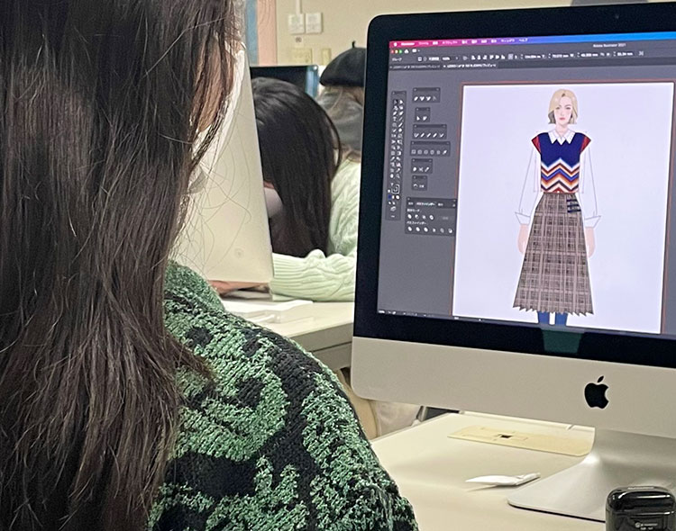 2年かけて、じっくりと洋服のデザインを追求することができます。私は、自分のデザインの幅をもっと広げたくて、この科を選びました。授業では、パターンメーキングでも立体裁断でも、自分の好きなようにデザインしたものを形にすることができます。フォトショップ、イラストレーターなどコンピュータを使った授業もあるので、デザインの幅がどんどん広がります。この科は、デザイナー志望の優秀な子たちが集まるという印象があり、ハードルが高いと思われがちですが、そんなことはまったくありません。クリエイティブな人が多いので、みんなから刺激をもらえてどんどん成長できます。実は私も、初めは少し不安だったのですが、実際に入ってみるとみんなポジティブで優しい人ばかり。あるとき自分のデザインはダメなのかなぁと落ち込んでいたら、ひとりのクラスメイトが「自分のデザインが一番可愛いに決まってる!」と励ましてくれて、自分の気持ちも一気に前向きに。それからは自分のデザインが好きになれました。