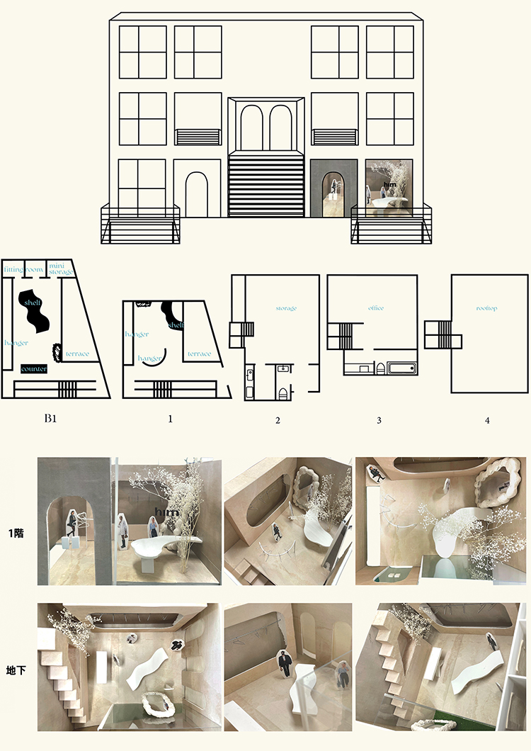 商品の企画から生産、販売まで、ファッションビジネスにおける実務的な内容を専門的に勉強します。必須科目であるマーチャンダイジングの授業では、実際にショップを運営する立場から、顧客ターゲットや商品の方向性、オーダーする点数まで、具体的に想定してビジネスプランを構築します。その一方で、服づくりやデザインも追求しながら、さらにグラフィック、インターネットビジネス、接客など幅広く学び、ファッションを総合的に理解し、企画をプロデュースする能力を磨きます。カリキュラムを通して、ひとつの企画が服として完成するまでの流れやその仕組みを具体的に理解していきます。全体の流れを理解したおかげで、パターンに起こすのが難しい洋服に直面したときに、一番良い解決方法を提案する力も身に付きました。ここは、自分次第で可能性はどんどん広がる学科。クラスメイトには、デザイン画の授業を頑張って、デザイナーとして就職が決まった人もいます。私は今、この学科で2年かけて習得したすべての知識と技術を使って、「自分のブランドを立ち上げる」という卒業制作に取り組んでいます。