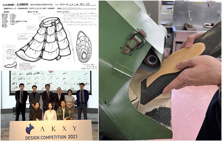 学生生活では、とにかく自分らしい作品をつくることを心がけました。自分のイニシャルや好きなゲームのキャラクターをデザインに取り入れた靴もつくったし、自分の出身地である佐賀県の名産品であるイカをモチーフにした面白いデザインの靴に挑戦したこともありました。また、企業主催のコンペティションにも積極的に応募。旭化成とミズノのコンペティションでは、両方ともデザイン画による一次審査を通り、実際にサンプルを制作して二次審査に進みました。ミズノは「着脱しやすいデザイン」というテーマから、かかとの部分が取り外しできるデザインにしたところ、かかとをしっかりと留めるスポーツシューズの常識を覆す学生ならではのアイデアだ、と評価していただけたのが嬉しかったです。一方、旭化成のコンペの際には、ほかの学生は企業側でサンプルをつくってもらっていたのに、自分のデザインが特殊すぎたせいか、僕だけ自分でサンプルをつくることに(笑)。ウェディングドレスをイメージした華やかなパンプスという凝ったデザインでしたが、試行錯誤しながらなんとか完成させ、指定素材部門賞をいただくことができました!