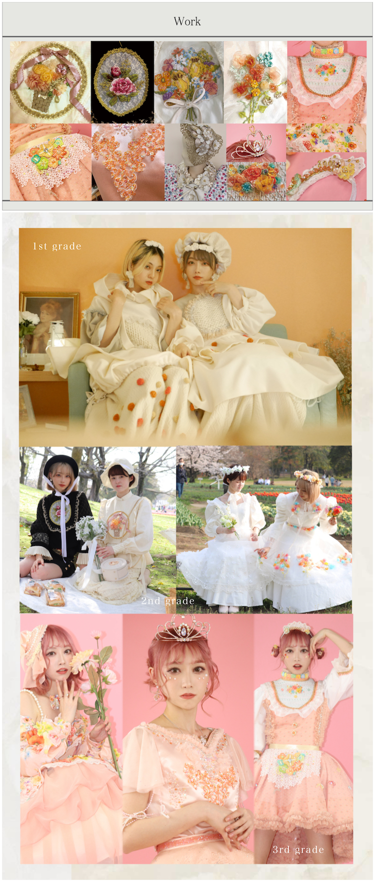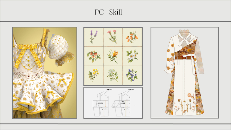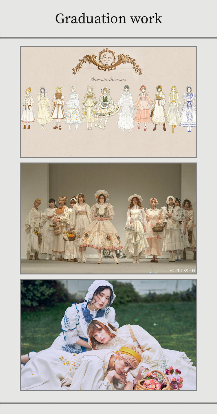 4年をかけてファッションの幅広い知識と服づくりを学び、自分の「好き」や「得意」を追求しながら高いレベルの技術を習得することができる学科です。私はここで大好きなデザインや装飾技術に磨きをかけつつ、苦手だった縫製技術も克服することができました。その上で、イラストレーターやフォトショップ、CADなどの実践的なスキルがしっかりと身につけられたことは、私にとって大きな財産になっています。また、課題が終わるたびにポートフォリオを制作し、スライドを使って発表するため、自然とプレゼンテーション能力も磨かれます。この科の特徴は、何と言っても4年間の集大成となる「プライベートコレクション」。ひとつのテーマのもと8体以上の服をつくるという本格的なコレクションで、ビッグプロジェクトです。企業とのコラボレーションもあり、プレゼンテーションで選ばれればファッションショーで披露することができ、さらには作品撮りやショーではプロのヘアメイクアップアーティストにヘアメイクをしてもらうことができます。嬉しいことに私は選んでもらえたので、ワクワクしながらショーに向けた打ち合わせを重ねて日々頑張りました。