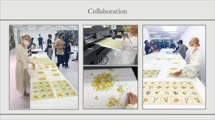 セイコーエプソン株式会社との企業コラボでは、私のポートフォリオが選ばれて、プライベートコレクションのためのテキスタイルを提供していただけることに! 3種類のテキスタイルを作るため、長野県にあるエプソンのソリューションセンターで、テキスタイルにデジタルプリントをしに行きました。3つのボタニカルアートをグラフィックに起こしたのですが、思い通りに仕上がらない部分は都度データから修正するなど、1年を通したコラボレーションだったので、色合わせに徹底的にこだわることができました。