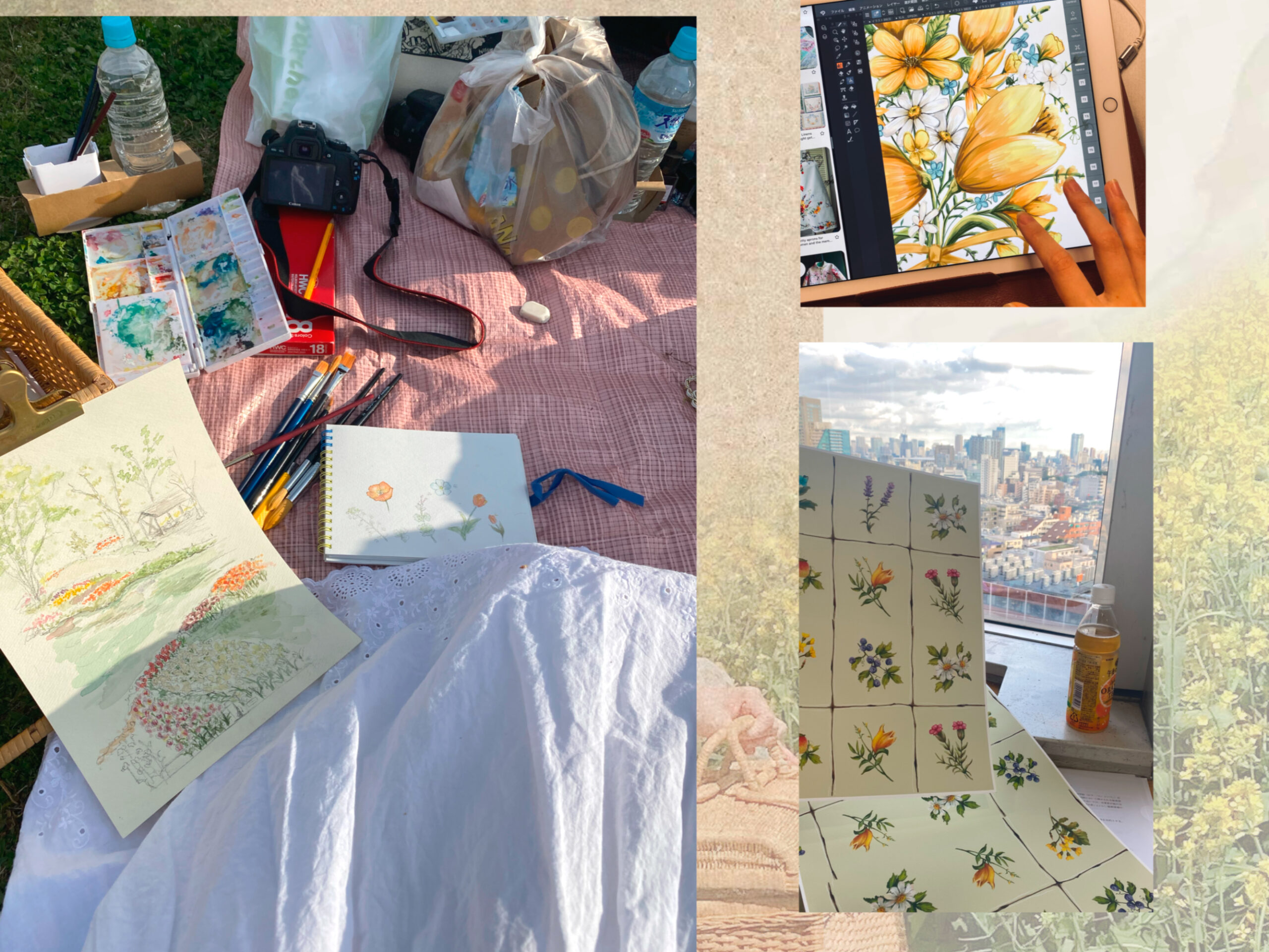 課題が多い学科ですが、私はいろいろな検定試験やコラボレーションに取り組んでいたので、スケジュールをしっかり立てて行動することを心がけました。入学するまでは、どちらかといえば時間にルーズなタイプだったのですが、入学後は時間がコントロールできるようになり、今日は何の課題を持って帰って、どこまで家で作業するか、どの課題のどのあたりまで終わらせるかなど、事前に考えて行動する癖がついたおかげで、時間の使い方がうまくなったと思います。時間のあるときは、アンティークショップ巡りや舞台鑑賞、美術館やライブに行くなど、いろいろなものを見て感性をアップデート。そこで得たものはデザインのインスピレーションになることも多く、刺激を受けた後はカフェでデザイン画を描くことも。
