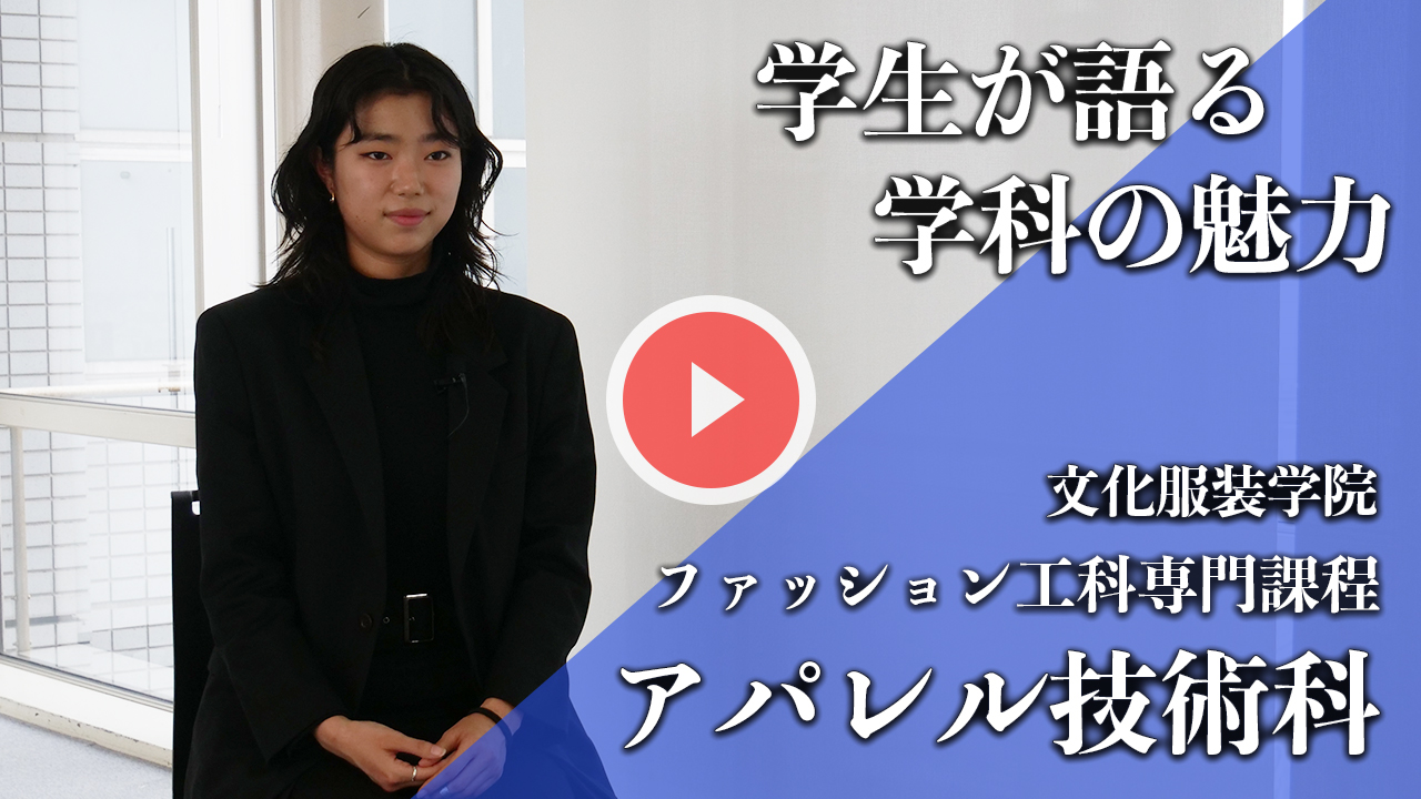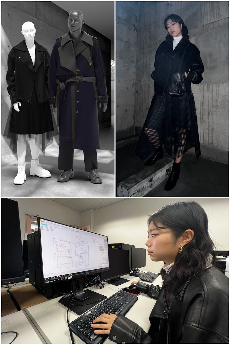 糸が出来上がるところから服が完成するまで、ファッションに関わる全過程について学んだ上で、パタンナーとして必要な知識と技術を身につける学科。個人作品のほか、工業用パターンを用いて量産についても理解を深めます。企業のパタンナーが実際に現場で使っているようなパソコン上でパターンを引く2DCADの技術を習得できるのが強みで、プロでも使いこなせる人がまだ少ないと言われている最先端の3DCADを学ぶ授業もあります。そして強調しておきたいのは、先生方の指導の素晴らしさ。わからないことがあったとき、すぐに答えを教えるのではなくヒントをくれたり、うまくいかない理由だけを指摘してくれるので、自分の力で答えに辿り着けたときに、その知識や技術が実力として身につきました。また、企業の生産現場で必要不可欠な仕様書、工程分析表、加工書などの作成法も学ぶため、この科できちんと勉強すれば、卒業後に即戦力としてアパレル業界で活躍できるようになると思います。
