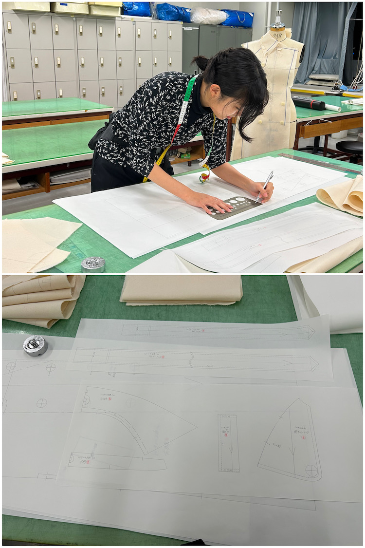 この科のカリキュラムの中で最も授業数が多い「パターンメイキング」が一番好きです。この授業では、パターンに必要な技術や知識、服の縫製技術を学びながら、ブラウス、スカート、スーツと大きなテーマに基づいて服づくりに取り組みます。2年次ではパターンを手引きし、細かな仕様に関してもすべて自分の手で書き込むので大変ですが、ここで基礎的な力が身につきます。3年次にはCADやプロッターというパターンのコピー機が使え、コンピュータでパターンを引くことができるようになります。私は課題ごとに自分の中で習得したい知識や技術など目標を定めて取り組んでいるのですが、課題を終えるたびに達成感が味わえるのもこの授業の醍醐味だと思います。