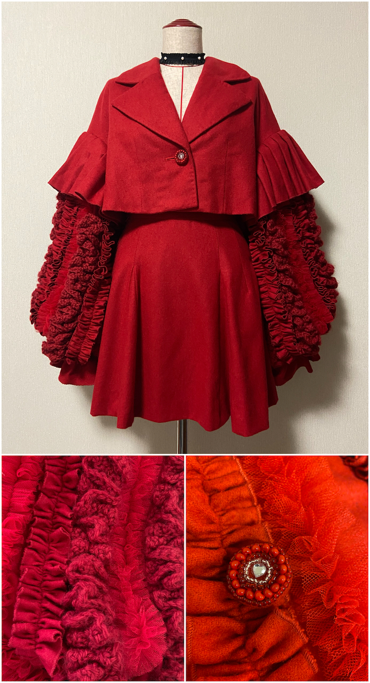 手縫いや刺繍の技術に加え、皮革や毛皮、レース、ベルベットなど高級かつ繊細な素材の扱い方を学び、オートクチュールという1点ものの服づくりを追求する学科。縫い代を割る(縫いやすいように縫い代を広げる処理のこと)のにも、革や毛皮の場合はアイロンを使わずに金槌で叩くなど、工作のような楽しさも味わえます。私は入学するまで刺繍はしたこともなかったのですが、課題で初めて手がけたことがきっかけで、刺繍の面白さに気づきました。少し立体感を出すだけで、光の当たり方や輝き方に違いが出ることを知り、舞台映えする衣装をつくる際にとても大切な要素になることを実感しました。そのほかにも、課題を通して扱いの難しい素材に何度も取り組むことで、自然と技術が磨かれました。グループ制作も多いため、グループ内で密に相談しながら課題を進めることで、コミュニケーション能力も向上!同じ目的意識を持った仲間と切磋琢磨しながら、作品も自分自身も高めることができました。