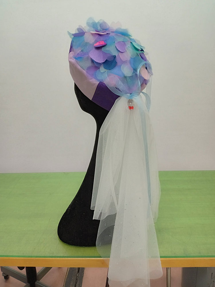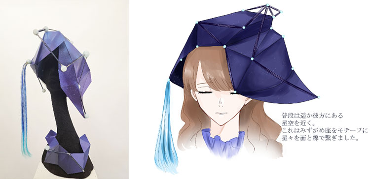 私は文化服装学院に入るまでは帽子づくりの経験ゼロでしたが、今ではいろんな形の帽子をみても、デザインやつくり方がすぐに浮かぶようになり、その成長ぶりに自分自身が一番驚いています。少人数制で先生が親身に教えてくれるので、習得のスピードが速いからだと思います。1年次はベレー帽やクロシェなど基本的なアイテムを制作して基礎を固めていきます。2年次はその応用。オリジナルの型をつくって立体裁断で仕上げるヘッドピースのような、芸術性の高い作品にチャレンジすることが増えます。文化祭のファッションショーや産学連携企画などで、服をつくる科とのコラボレーションがあるのもポイント。服の方向性が決まってから制作に取りかかるので大変ですが、頭からつま先まで全身をイメージしながら帽子を考える姿勢が身につき、発想力が豊かになると思います。文化服装学院だから得られる特別な経験のおかげで、私はますます帽子づくりが好きになりました。