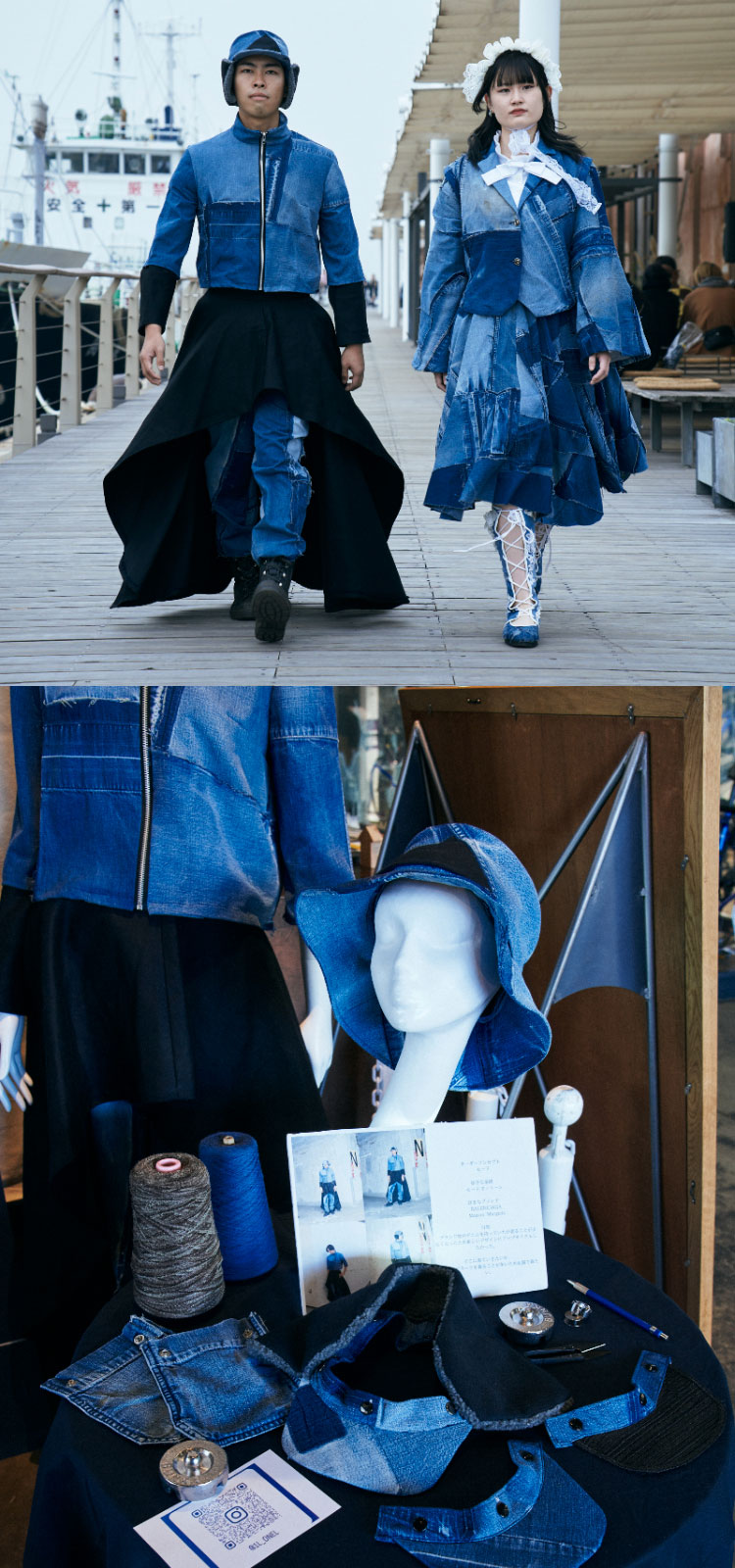 広島県福山市で立ち上がったサーキュラーエコノミープロジェクトの「REKROW(リクロー)」と文化服装学院がコラボレーション。「REKROW」が回収したユーズドのデニムのワークウェアを、インダストリアルマーチャンダイジング科と帽子デザイン科を含むファッション工芸専門課程の学生たちが協力し、サステナブルに考慮したアイテムに蘇らせ、その作品をファッションショーとインスタレーションで披露しました。普段は自分の作品づくりに没頭していますが、この時は他科の学生や企業の方など多くの人と共同でものづくりをしたので初めてのことがいっぱい。慣れないことに焦りつつも新鮮な気づきが多く楽しかったです。