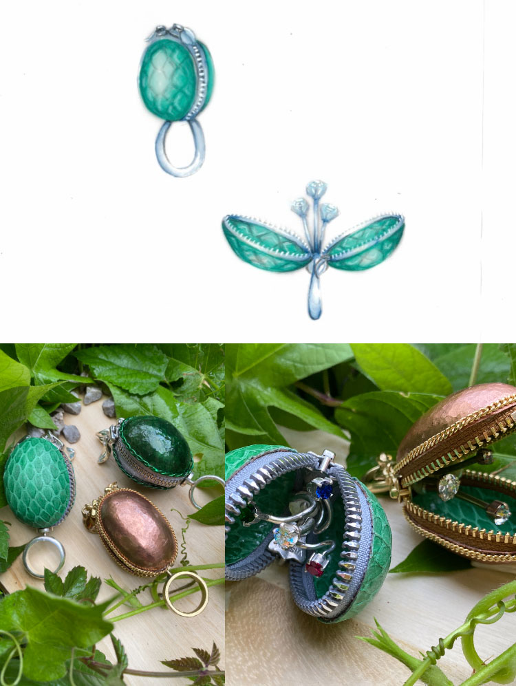 自分の専門以外のファッショングッズをつくる授業です。バッグ、財布、帽子を制作しましたが、布や革などジュエリーとは無縁だった素材に触れ、ミシンを初めて使いました。クラスメイトを見ると、専門分野によって同じ素材や機械でも扱い方が違っていて興味深かったです。次第に、このデザインだと金属は不可能だけれど革なら可能だよね、という考えが出てくるようになり、ジュエリーとは無縁の素材でも結びつけられる発想力が身につき、表現の幅が広がりました。