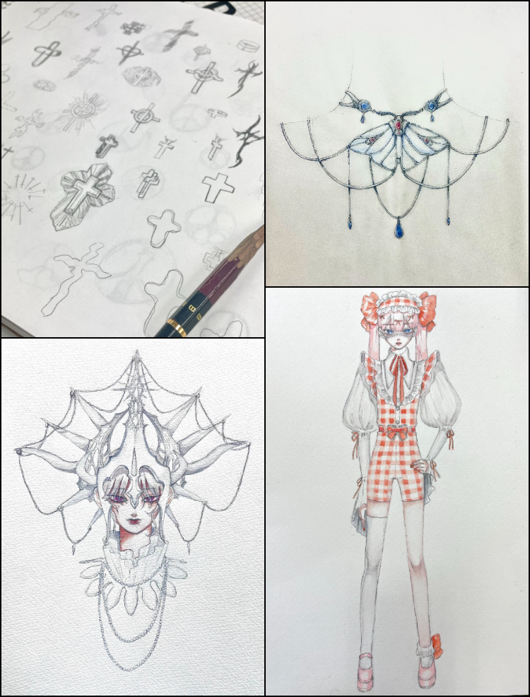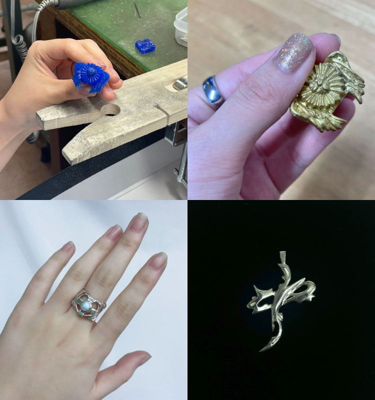 初心者でゼロからのスタートでしたが、今ではすっかりジュエリーづくりに魅了されています。特にワックス(ろう)を削って彫刻のような作品が完成した時の達成感は大きいです。ほかにも1年次にあった「デッサン」と「服装解剖学」の授業は興味深かったです。骨格や可動域を理解すると、つけ心地の良さとデザインが合わさったジュエリーを考えられるようになりました。