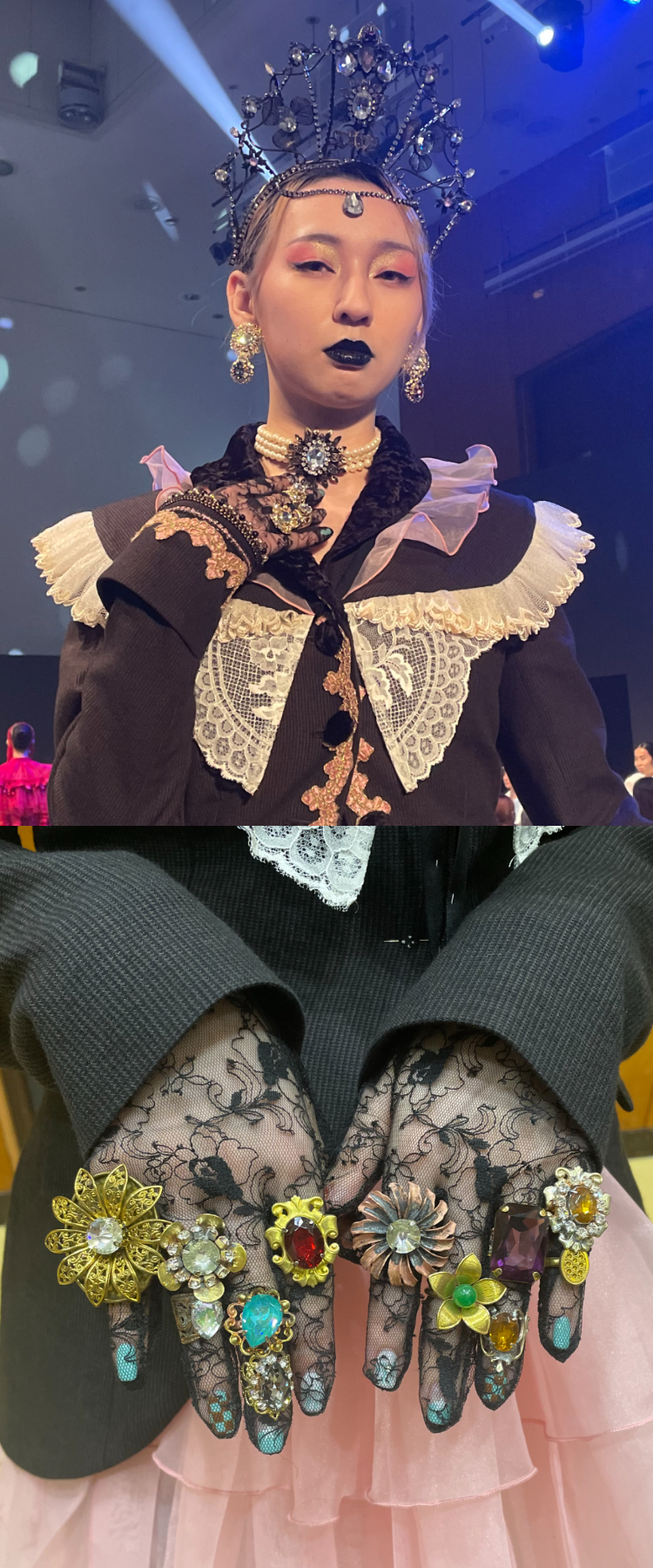 ジュエリーデザイン科を含むファッション工芸専門課程の学生は、2年次になるとアクセサリー担当として文化祭のファッションショーに携わります。服のデザインが決まったあとに取りかかるので制作期間が短いのが辛いところ。しかも私たちのところは急遽の追加依頼で、3日間でティアラ、ネックレス、リングを仕上げることに。同じチームのクラスメイトと一緒に効率よく手を動かして何とか間に合って完成。モデルさんがジュエリーを身につけたら作品全体の完成度がさらに上がって感動しました。服の引き立て役ではありますが、その存在はすごく大きいな、と。フィッティングも担当したのですが、舞台裏は暗いので装着しやすいデザインにすることも大事だな、とも。文化服装学院だから得られた気づき、いい経験になりました。