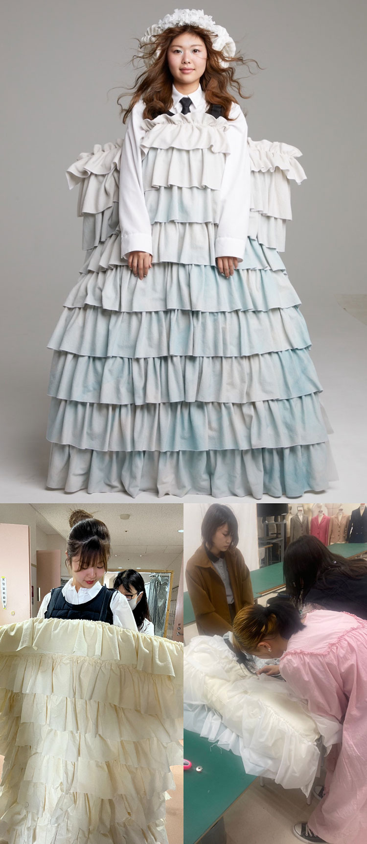 例年の文化祭ファッションショーでは、企画セクション全体でデザインを決定していたのですが、今年は個人のオリジナル作品を発表できる形式での実施だったので、私もデザインを応募しました。デザイン画を提出して結果を待っていたら……選ばれてびっくり。それが5月ごろのことで、ショーがある11月まで怒涛の日々でした。自分一人ではなくチームで作品を仕上げていきます。誰とチームを組むのか、どんなスケジュールで進めていくのか、誰に何を指示するのか。デザイナーを務める私が全てを判断して動かなければなりません。まず縫製が上手なクラスメイトに声をかけ、次にファッションテキスタイル科と帽子デザイン科の先輩に布地の染色とヘッドアクセサリーの依頼、それからシーン長に連絡して……という感じで、人生で一番、たくさんの人とLINEしました。自分の思いを言語化して人に伝えることの難しさを痛感。1年生なので授業でまだ教わっていない技術もあって未熟者であることを再認識させられました。でもチームみんなからの励ましと先生からの温かいサポートのおかげで作品は無事完成。ショー当日、自分たちの作品を着たモデルさんが歩く姿を見て胸が熱くなり、終了後はチームみんなで大泣きしました。本当に辛かった。でも本当に楽しかった。来年もまた挑戦しようと決めています。