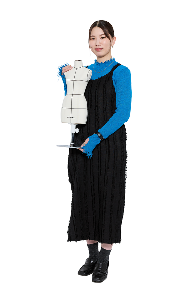 基礎から応用までの服づくりを中心に、ファッションに関する知識と技術を学びます。入学時にファッション工科基礎科と迷う人もいると思いますが、どちらにするかポイントの一つに修了年次の違いがあります。服装科は2年間、工科基礎科は進級を含めると3年間。なので2年間で就職したい、2年間で服づくりを習得したいと思っている人は、服装科がオススメです。実は私は高校から服づくりを勉強していたこともあって工科基礎科も魅かれましたが、短い期間で就職に繋げたい思いが強かったので服装科を選びました。クラスの中には私のような経験者もいれば、服をつくったことのない未経験者の人もいて、最初は進行具合や完成度にも差がありますが、1年間で服づくり未経験だった人も一通りの服がつくれるまでに成長し、なりたい自分の将来が見えてくると思います。私はこの2年間で、苦手意識のあったデザインも出てくるようになり、より自分らしい服づくりができるようになりました。卒業後は私のように、就職をする子もいれば、さらに専門技術をもっと極めたいと思ったら、もう1年進学することも可能です。